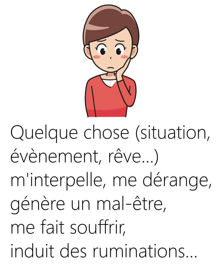 l'observation de soi : surveiller ses pensées, ses émotions, ses réactions, repérer les évènements déclencheurs de souffrance ou mal-être. Ce qui sert